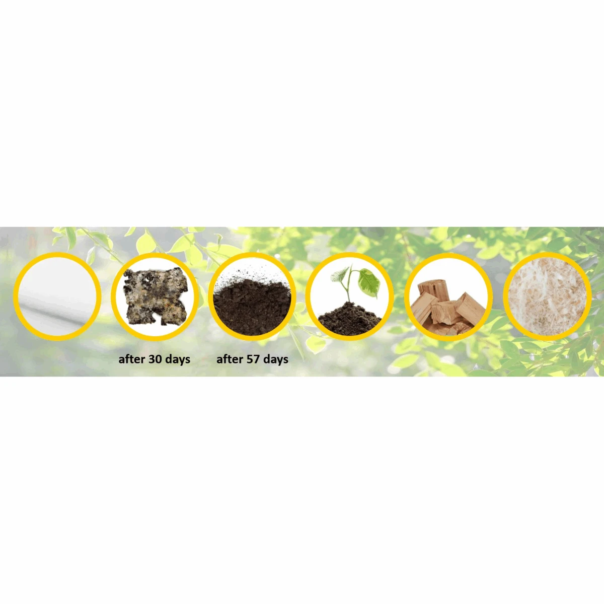- Compostable after 30 days and completely biodegradable in natural conditions and soil within 57 days
