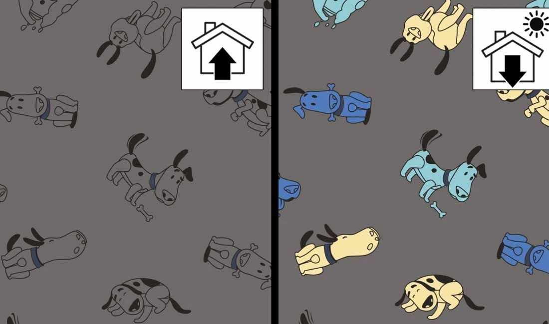 Cotton-rich jersey fabric with magical Light Reactive design. The fabric shows one design in ‘standard indoor’ light and displays an array of colourful shades when is then exposed to the UV rays in sunlight.