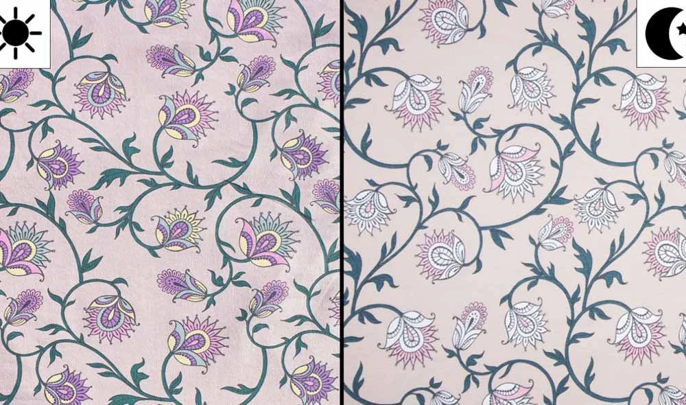 Cotton-rich jersey fabric with magical Light Reactive design. The fabric shows one design in ‘standard indoor’ light and displays an array of colourful shades when is then exposed to the UV rays in sunlight.