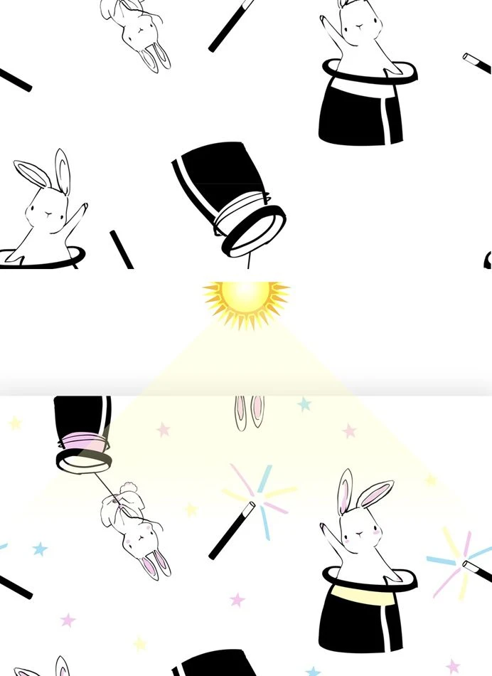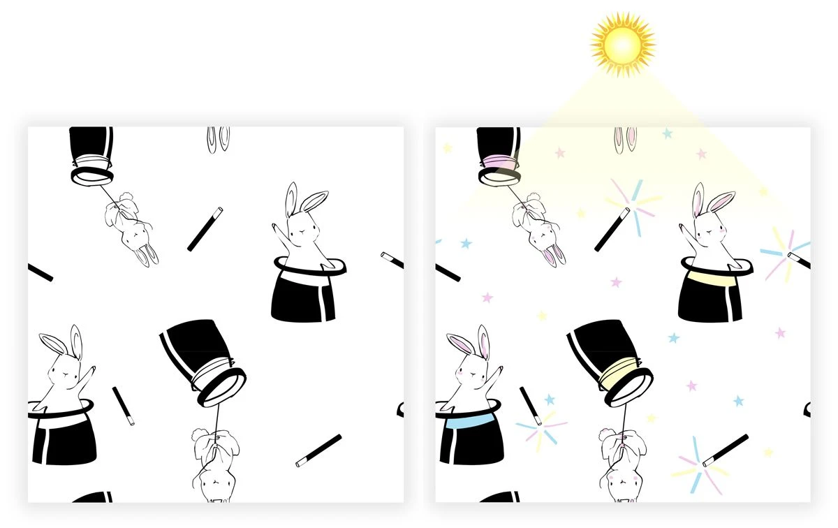 Cotton-rich jersey fabric with magical Light Reactive design. The fabric shows one design in ‘standard indoor’ light and displays an array of colourful shades when is then exposed to the UV rays in sunlight.
