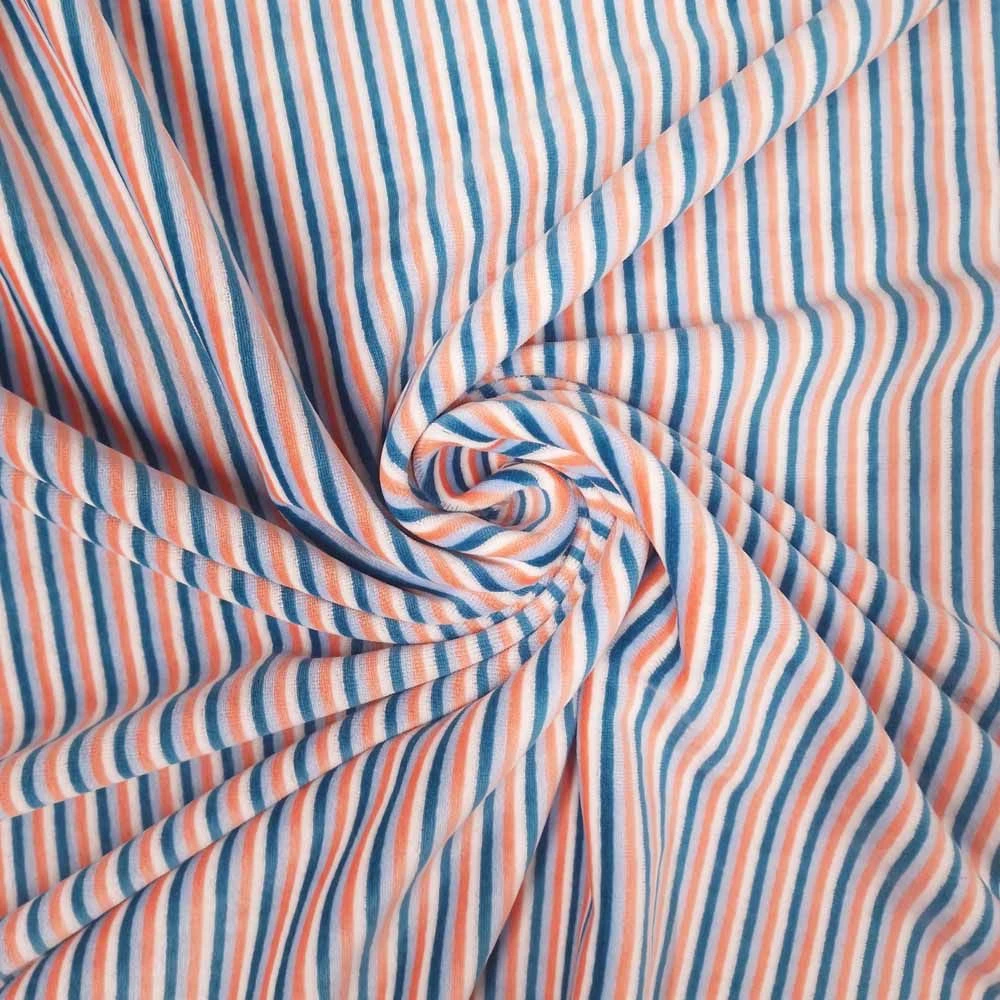 Mid – heavy weight Jersey Fabric with classic stripe and velour touch finish. High cotton content ensures the fabric has a lovely feel.